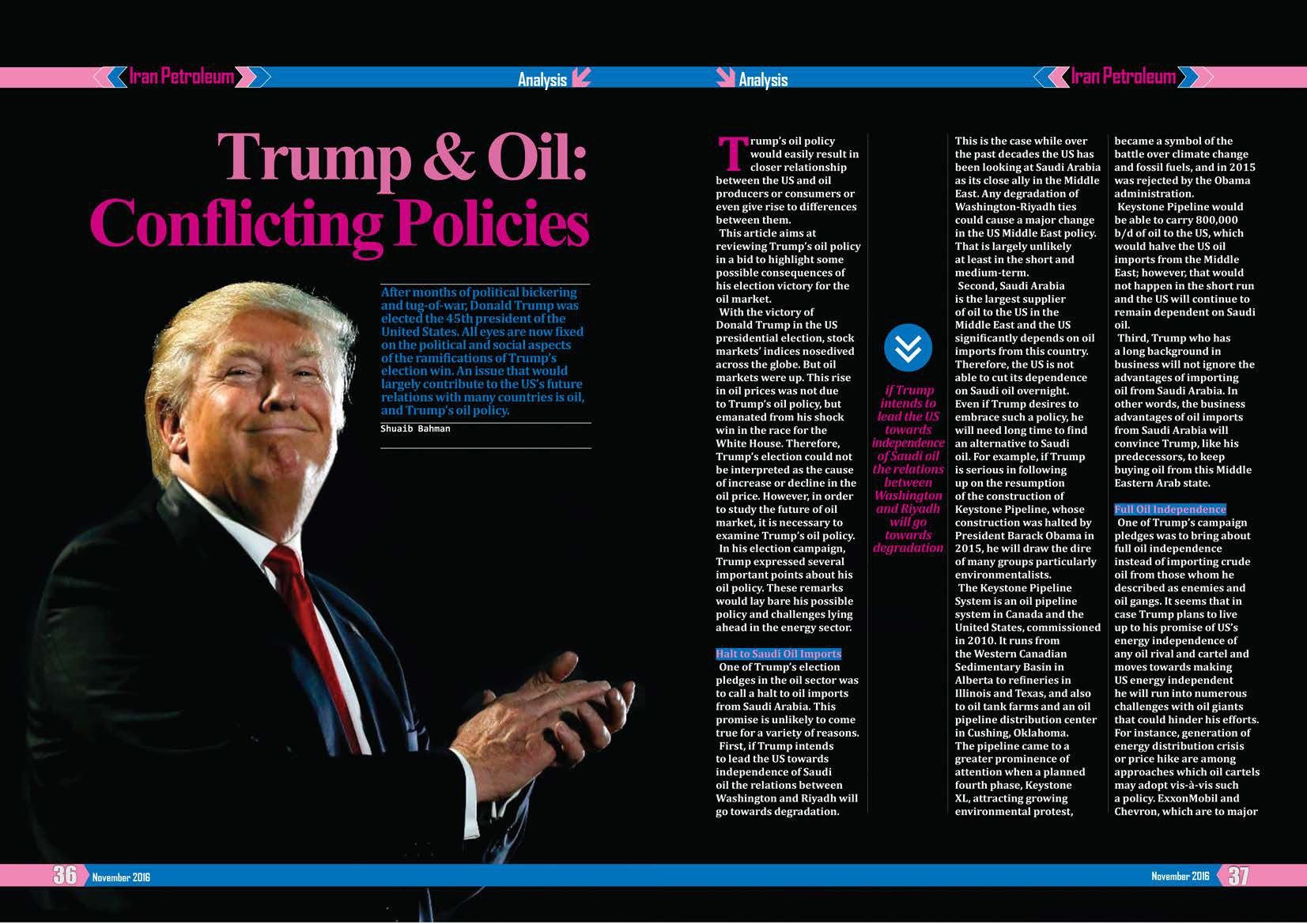 With the victory of Donald Trump in the US presidential election, stock markets' indices nosedived across the globe. But oil markets were up. This rise in oil prices was not due to Trump's oil policy, but emanated from his shock win in the race for the White House. Therefore, Trump's election could not be interpreted as the cause of increase or decline in the oil price. However, in order to study the future of oil market, it is necessary to examine Trump's oil policy.
