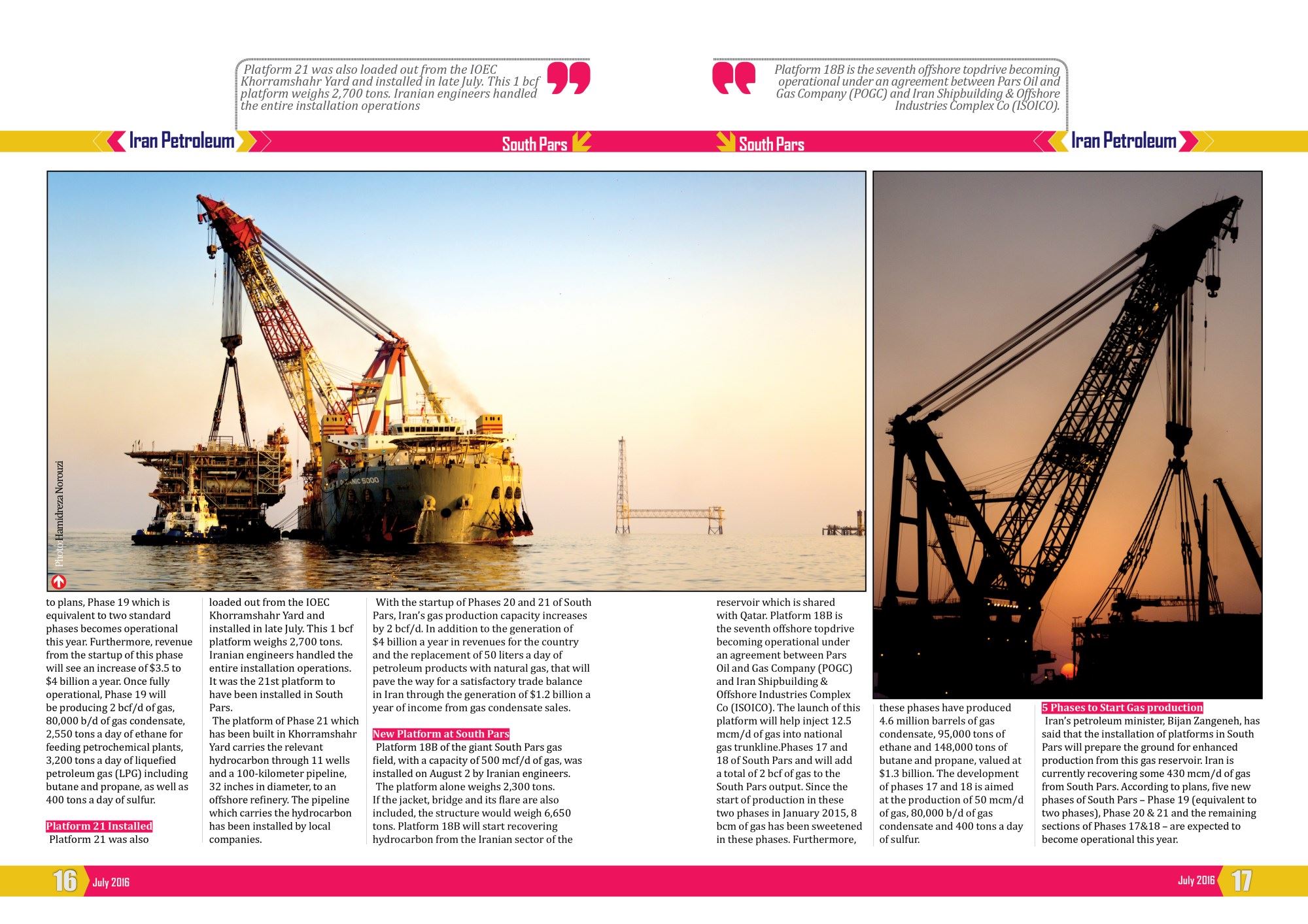 Phases 17 and 18 of South Pars and will add a total of 2 bcf of gas to the South Pars output. Since the start of production in these two phases in January 2015, 8 bcm of gas has been sweetened in these phases. Furthermore, these phases have produced 4.6 million barrels of gas condensate, 95,000 tons of ethane and 148,000 tons of butane and propane, valued at $1.3 billion.