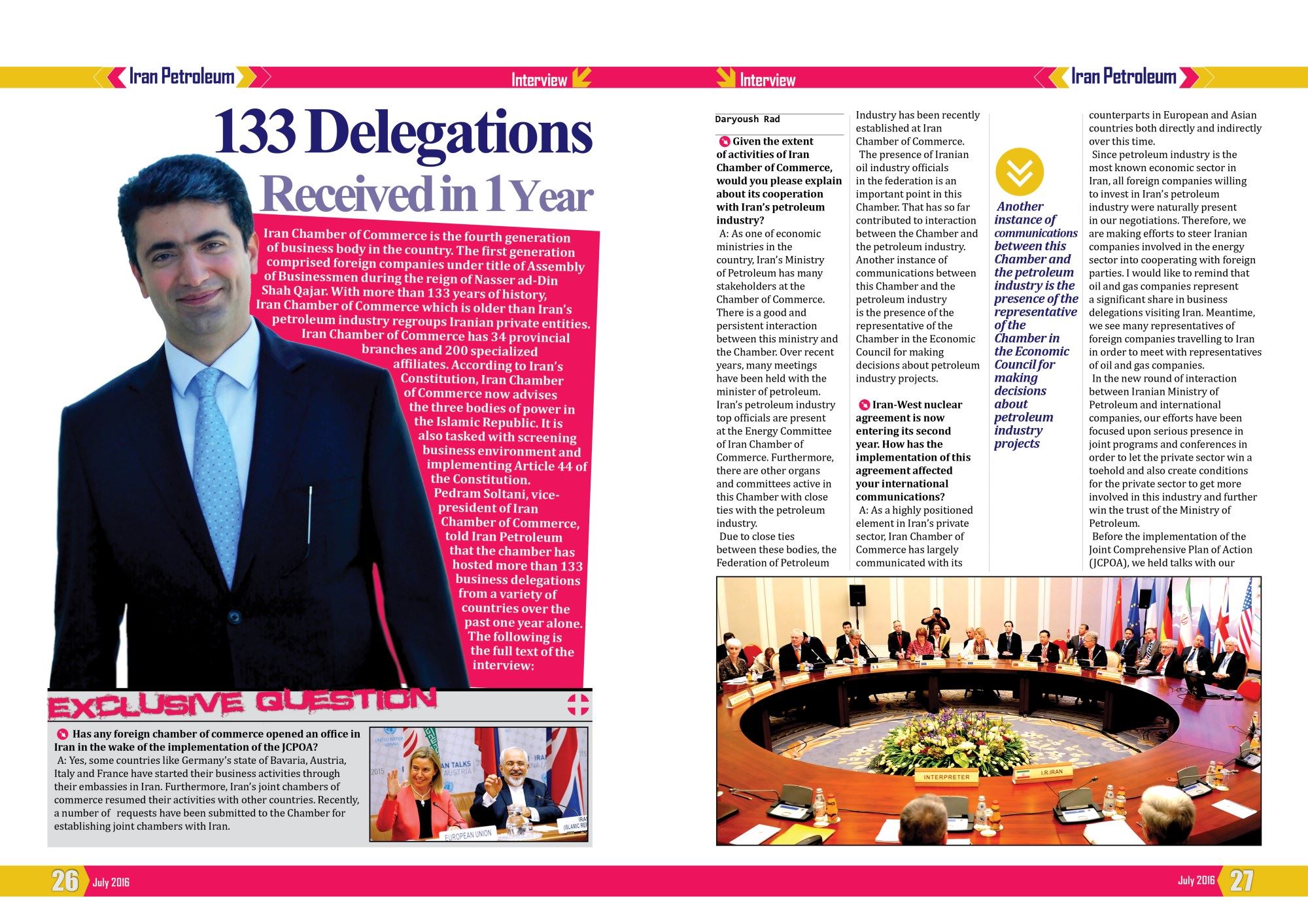 Pedram Soltani, vice-president of Iran Chamber of Commerce, told Iran Petroleum that the chamber has hosted more than 133 business delegations from a variety of countries over the past one year alone.