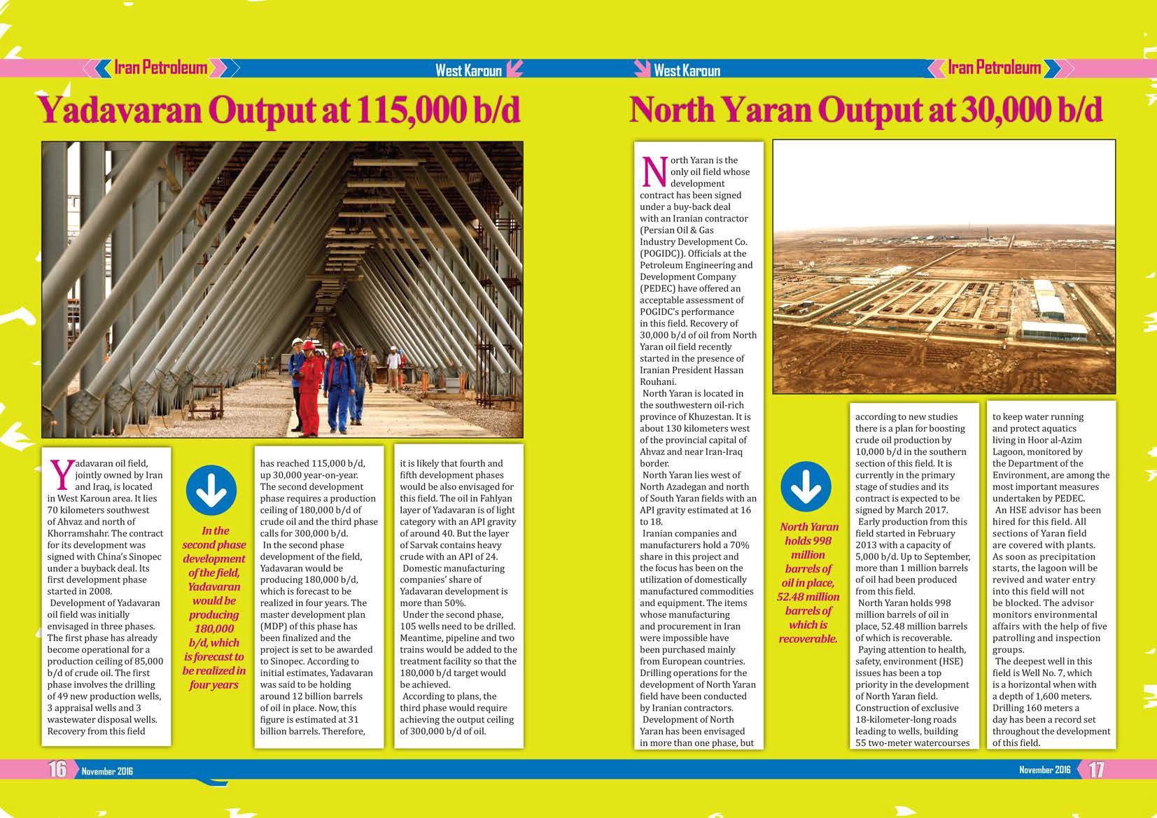 Development of North Yaran has been envisaged in more than one phase, but according to new studies there is a plan for boosting crude oil production by 10,000 b/d in the southern section of this field. It is currently in the primary stage of studies and its contract is expected to be signed by March 2017.